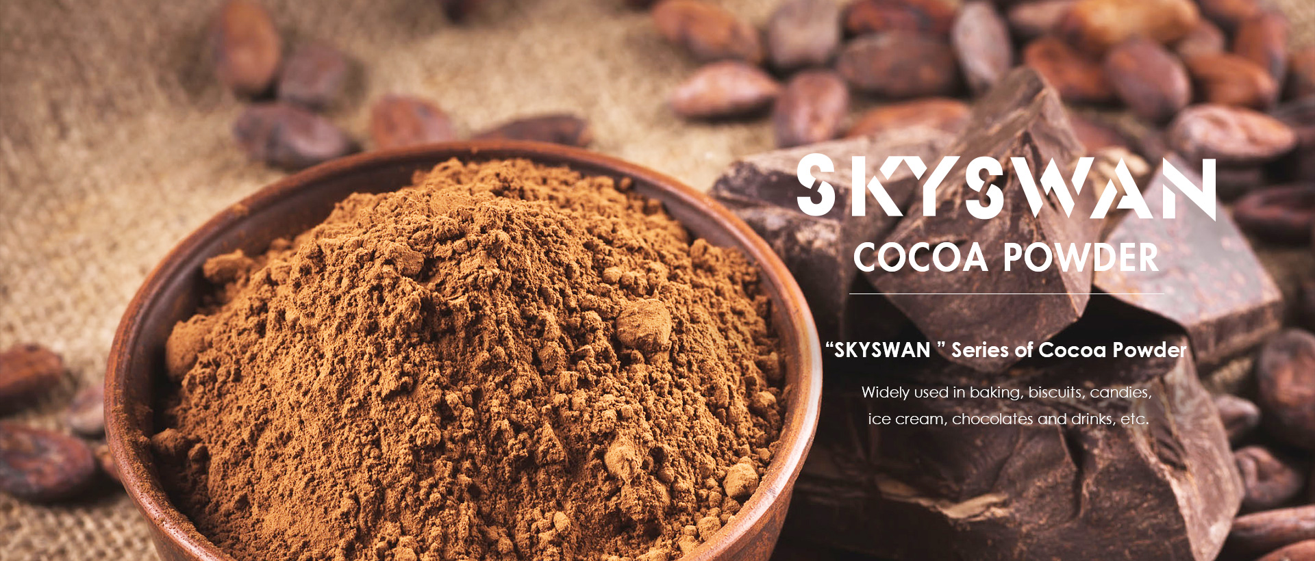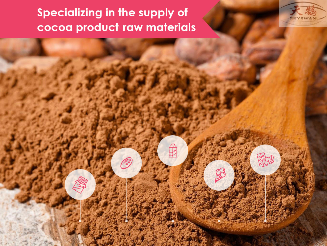 Main products include "Skyswan" series of Cocoa Powers such as Natural Cocoa Powder, Alkalized Cocoa Powder, Black cocoa powder, High-fat cocoa powder, small packaging cocoa powder, cocoa butter, cocoa liquor, cocoa cake, etc. Products are widely used in baking, biscuit, ice cream, chocolate and candy, beverage and other fields.
